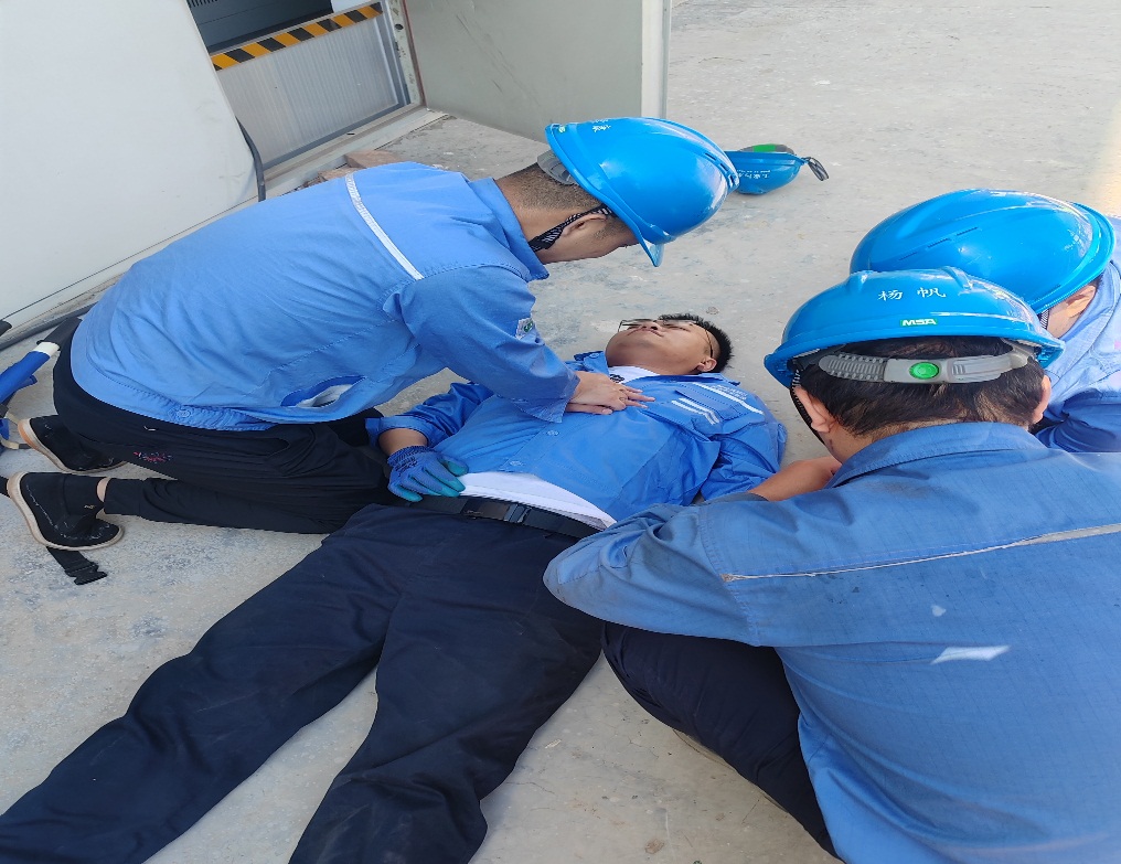 演練現(xiàn)場(chǎng),現(xiàn)場(chǎng)操作員王斌斌在作業(yè)時(shí)不慎觸電,昏迷倒地?,F(xiàn)場(chǎng)監(jiān)督人員??蛋l(fā)現(xiàn)后立即采取措施,斷開(kāi)電源,并撥打120請(qǐng)求支援。