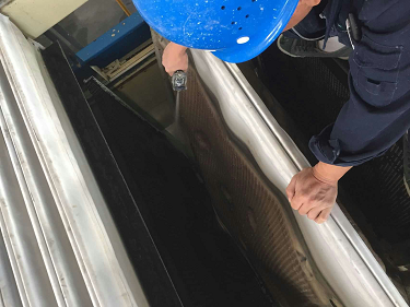 近期,由于水質(zhì)變化較大,污泥量明顯增加,導致污泥池液位持續(xù)升高,板框壓濾機濾布結垢嚴重,經(jīng)過多次水洗酸洗效果不佳,為盡快降低污泥池液位,緩解生產(chǎn)壓力,提高板框壓濾機的壓泥效率,最終經(jīng)研究由機修人員利用高壓水槍逐塊進行人工清洗,并對結垢嚴重的濾布送到化驗室進行不同濃度酸浸泡實驗,解決板框機濾布結垢問題。